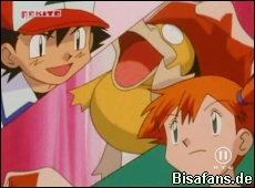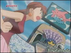 Und so kommt es am nächsten Morgen zu einem Kampf zwischen Misty und Trinity. Misty verläßt sich erneut auf Quaputzi, während Trinity ein mächtiges Garados einsetzt. Quaputzis provisorischer Blubber wird jedoch von einem Hyperstrahl des Garados zurückgeworfen und geht dabei auch noch K.O. Misty muß nun ihr Corasonn einsetzen.