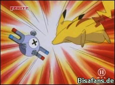 Jasmin wählt als nächstes natürlich ihr mächtiges Stahlos. Das geschwächte Pikachu startet mit einem Donnerblitz, was jedoch nur bedingt Wirkung hat. Doch nach einem Eisenschweif geht Pikachu in die Knie. Ash muß nun auch sein zweites Pokémon einsetzen.