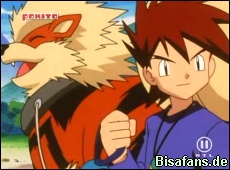 Im folgenden Kampf hat das erschöpfte Lorblatt von Ash keine Chance gegen Arbok. Doch Gary kommt mit seinem Arkani zur Hilfe unbd kann Team Rocket mit einem Flammenrad vertreiben.