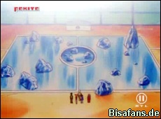 Heute ist es nun soweit. Norbert zeigt Ash und seinen Freunden die Arena von Mahagonia City. Diese besteht aus einer Eisfläche mit einer Wasserfläche in der Mitte. Der Schiedsrichter des 2 vs. 2 Kampfes ist übrigens Sheela.