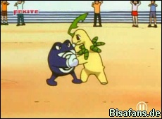Doch Misty kann Ash im letzten Moment überzeugen, dass Misty zuerst antreten darf. Schließlich ist das Quappo ein Wasser-Pokémon. So startet der Kampf.