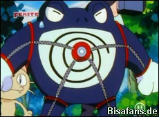 Team Rocket freut sich inzwischen über die Beute und versucht das Quappo dazu zu überzeugen ihnen zu gehorrchen. Dies klappt jedoch nicht und alle bekommen einige der Attacken von Quappo zu spüren.
