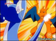 Glurak legt mit einem Flammenwurf los, vor dem sich Dragonir unter Wasser versteckt. Der nun folgende Hyperstrahl-Attacke von Dragonir kann Glurak in der Luft ausweichen. Gegen Dragonirs Drachenwut kann Glurak jedoch nichts machen und stürzt kurz zu Boden.