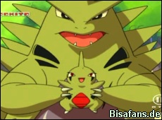 Erst eine ganze Weile später kann Larvitar seine Mutter überzeugen, daß Ash, Misty und Rocko seine Freunde sind. Ein Grund zur Freude. Doch die Freunde hält nicht lange, da Despotar plötzlich von einem Gangstertrio unter Führung eines gewissen Braggo in einem Roboter gefangen wird.