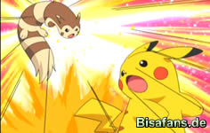 Die erste Attacke von Pikachu kann das Wiesenior mit Doppelteam locker abwehren und kontert sogar mit einem mächtigen Sternschauer. Pikachu gibt aber nicht auf und will den Ruckzuckhieb einsetzen. Doch ein Schaufler von Wiesenior überrascht Pikachu, welches erneut einstecken muß. Es sieht alles andere als gut aus für Ash und Pikachu.