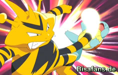 Als Elektek erneut Donnerblitz einsetzen will, überrascht Schiggy mit einer blitzschnellen Aquaknarre. Doch auch Elektek kann mit einem überraschenden Hieb aufwarten, der Schiggy zurückwirft. Schiggy gibt jedoch nicht auf und trifft mit seiner Aquaknarre erneut exakt die gleiche Stelle wie zuvor. Das Zieltraining bei der Feuerwehr hat offenbar viel geholfen bei Schiggy. Nach einer mächtigen Schädelwumme kann Schiggy schließlich Elektek K.O. setzen!