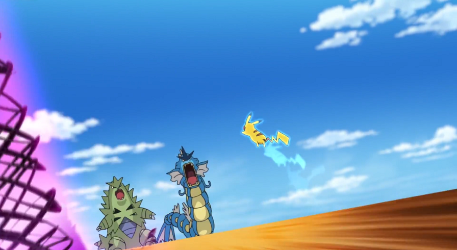 Pikachu tut sich schwer, gegen Despotar und Garados zu bestehen und nimmt durch deren Attacken großen Schaden. Gerade als es so scheint, dass Pikachu nicht mehr weiterkämpfen kann, setzen die Bisaknosp Solarstrahl ein und schaffen es so, die Attacken von Team Rockets