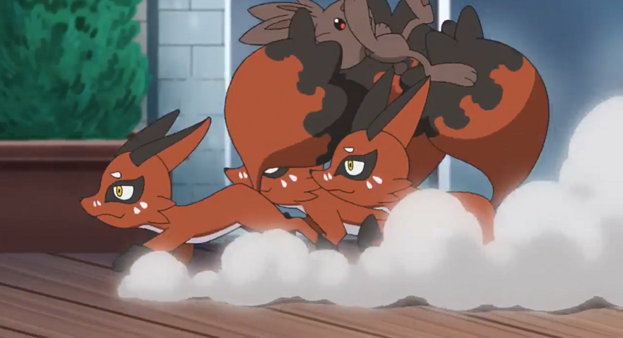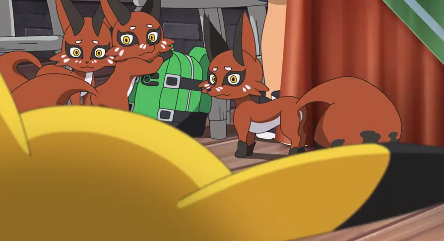 die beiden abgelenkt sind, bemerkt Pikachu drei fuchsartige, ihnen ebenfalls unbekannte Pokémon, die sich an Ashs