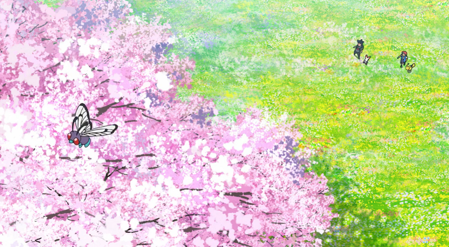 Daraufhin bemerkt Goh ein Smettbo, dem die beiden Trainer eilig aus dem Wald auf eine Wiese mit einem großen Kirschbaum folgen. Zu Gohs Erstaunen verfehlt er, nach den zahlreichen erfolgreichen Versuchen in Serie, mit seinem ersten Wurf das Käfer-Pokémon. Dank Ashs Unterstützung kann er aber schnell auf den Baum klettern und mit der Unterstützung seines Hopplo auch dieses Pokémon fangen.