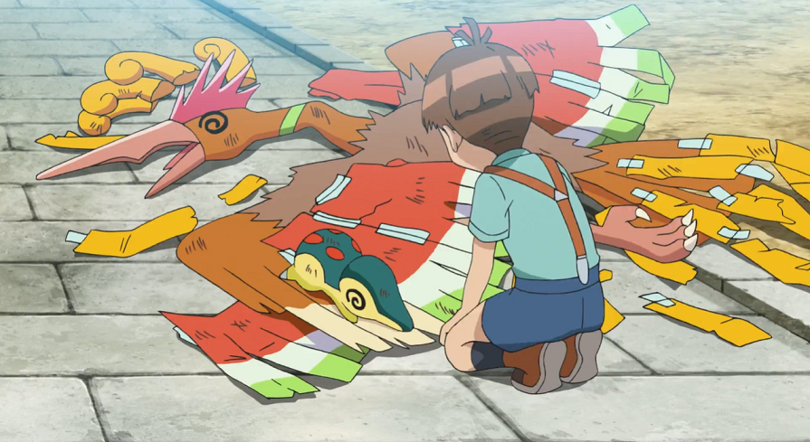 Es beginnt zu regnen. Can berichtet Ash und Goh von seinem Großvater. Demnach habe dieser in jungen Jahren Ho-Oh beinahe getroffen, es jedoch aufgrund wolkigen Wetters nicht sehen, dabei aber eine Buntschwinge erhalten können. Anschließend habe er viele Versuche unternommen, um Ho-Oh zu finden, sei aber stets erfolglos geblieben. Eines Tages sei er dann völlig desillusioniert von einer Reise zurückgekehrt, habe jegliches Interesse an dem Legendären Pokémon verloren und gebe sich seitdem davon überzeugt, dass Ho-Oh nicht existiere, da es sich ihm nach all der langen Zeit nie gezeigt habe. Um ihn aufzumuntern und sein Interesse an Ho-Oh wieder zu wecken, habe Can zu diesem Trick gegriffen und seine beiden Pokémon als Ho-Oh verkleidet.