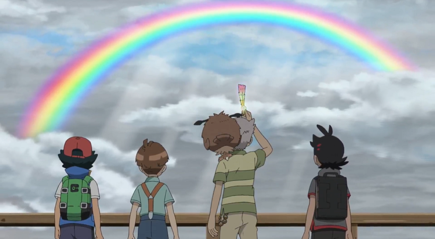 Gemeinsam setzen sie den Weg fort. Auch die letzten, inzwischen etwas ramponierten Stufen zur Turmspitze können sie zusammen überwinden. Dort angekommen, hat es inzwischen aufgehört zu regnen. In der Hoffnung, dass nun ein Regenbogen auftaucht, beginnt Can mit der Buntschwinge in der Hand winkend, gemeinsam mit Ash und Goh und beobachtet von seinem Großvater, nach Ho-Oh zu rufen. Kurz macht sich Ernüchterung breit, als nach kurzer Zeit geschieht. Doch plötzlich reißen die Wolken auf und ein Regenbogen wird sichtbar, weshalb sie ihre Rufe wieder verstärken.