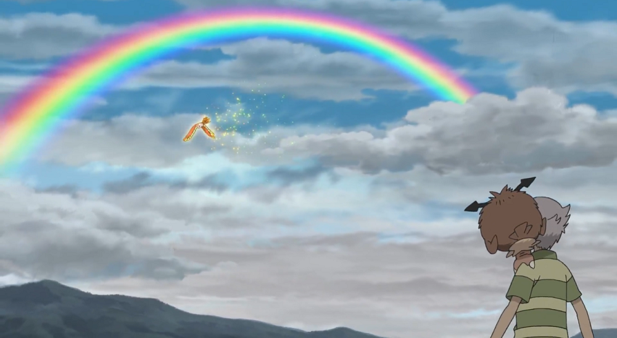 Eine Windböe entreißt Can auf einmal die Buntschwinge, sie kann aber von seinem Großvater aufgefangen werden. Dieser zeigt sich beeindruckt von der Hartnäckigkeit der drei, bedankt sich dafür und beginnt nun selbst mit der Buntschwinge nach Ho-Oh zu rufen. Doch wieder passiert nichts. Müde von den vielen Rufen will Cans Großvater den Versuch beenden, kündigt aber an, bereits am nächsten Tag seine Suche nach Ho-Oh wieder aufzunehmen. Daraufhin beginnt die etwas verblasste Buntschwinge aufzuleuchten und erhält ihre ursprünglichen kräftigen Farben zurück. Hungrig machen sie sich auf den Weg nach unten. Ash, Goh und Can sind bereits vorausgeeilt, als der Großvater nochmals einen Blick zum Himmel wirft, wo er nun Ho-Oh unter dem Regenbogen hindurchfliegen sieht. Schnell ruft er die anderen zurück, doch als reagieren, ist das Legendäre Pokémon bereits wieder verschwunden.