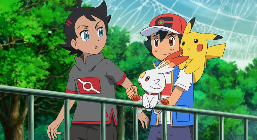 Ash und Goh beobachten mit Freude und Stolz an diesem Morgen die zahlreichen Pokémon, die Goh bereits fangen konnte, im Park von Professor Kirsch. Auch Ashs neu gefangenes Dragoran hat sich bereits mit einigen von Gohs Pokémon anfreunden können.