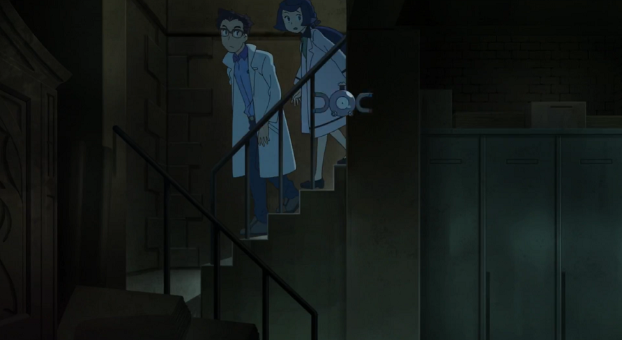Im selben Moment kommt auch Christin, Professor Kirschs Assistentin zur Arbeit. Gemeinsam betreten sie das Labor und wundern sich über die offene Tür sowie die Dunkelheit, als sie von Renés Magnetilo erschreckt werden. Dieses führt sie in den Keller, wo sie den vor Schreck erstarrten René auf dem Boden liegend finden. Da sich das Gengar auch ihnen gegenüber zeigt, wissen sie auch gleich, mit welchem Übeltäter sie es zu tun haben.