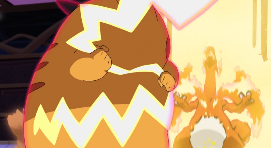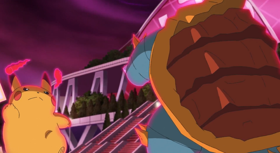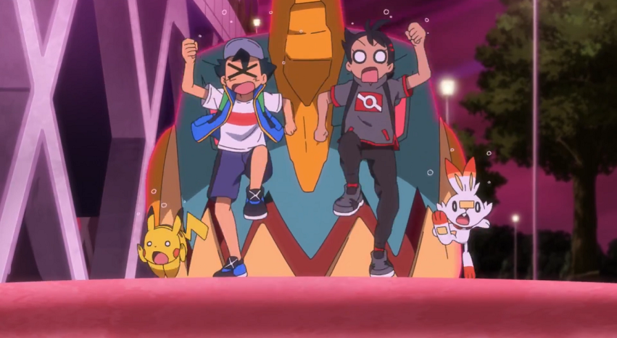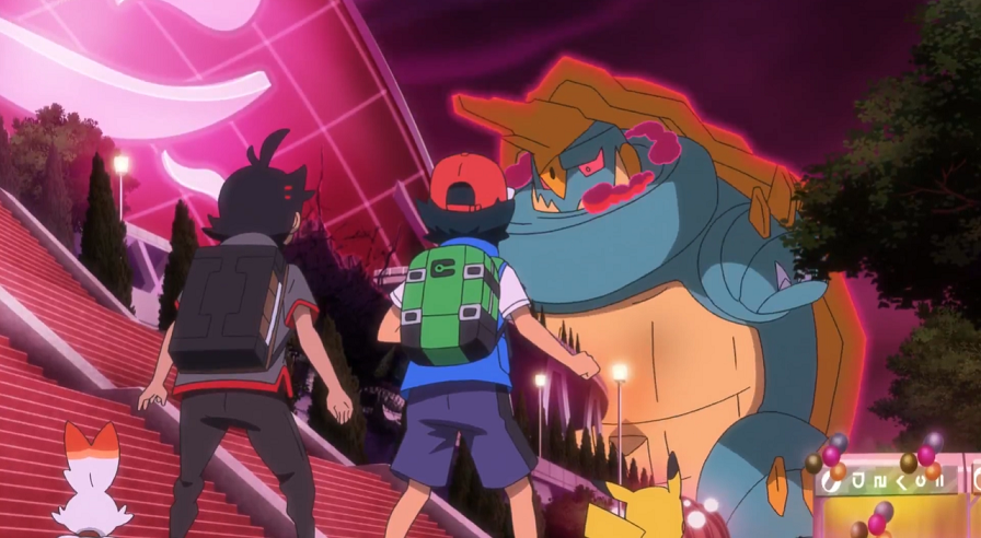 Vor dem Stadion angekommen, versuchen sie zuerst, das Gigadynamax-Pokémon mit Worten zu besänftigen, was aber nicht funktioniert. So entschließt sich Ash dazu, gemeinsam mit Pikachu sowie mit Goh und dessen Hopplo den Kampf aufzunehmen.