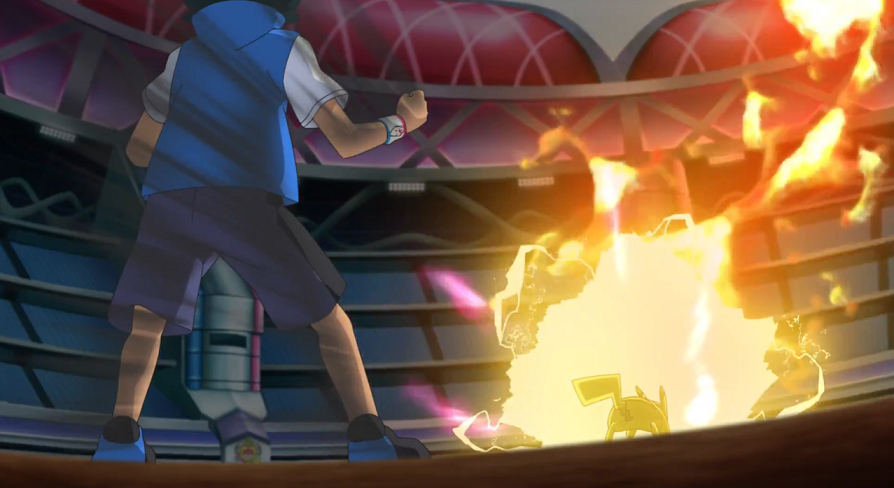 Der Kampf beginnt. Ash schickt Pikachu in den Kampf, Delion tritt mit seinem Glurak an.