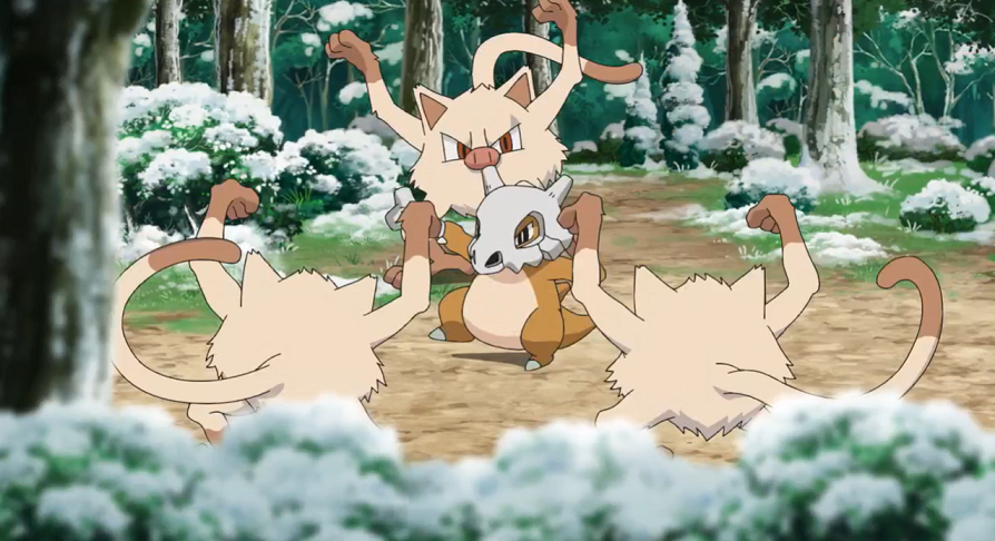 Mit einer Nanabbeere als Köder legen sich Ash und Goh sowie Gohs Pokémon versteckt im Gebüsch auf die Lauer. Und tatsächlich, kurz darauf tauchen die Menki wieder auf und werden daraufhin gleich von Pikachu und Hopplo in einen Kampf verwickelt. Gemeinsam mit Gohs Smettbo gelingt es ihnen, die Menki dingfest zu machen. Die Schwein-Affen-Pokémon wollen Tragossos Knochen allerdings verloren haben und beteuern, nicht zu wissen, wo dieser sich nun befinde. Ash und Goh gelingt es jedoch, dem nun wieder traurigen Tragosso Mut zu machen.