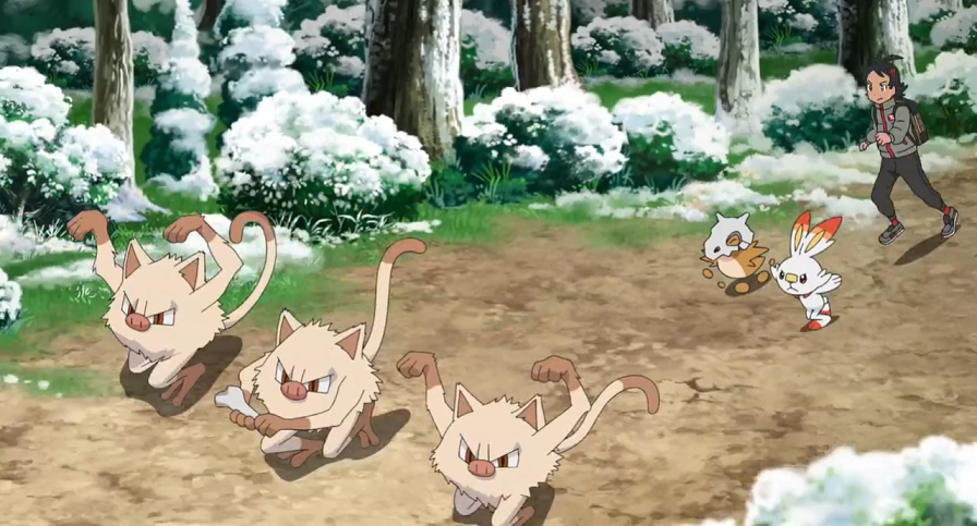 Gemeinsam mit Hopplo macht er sich durch die Kälte auf den Weg, wobei sie auch einen Park durchqueren müssen. In diesem bemerken sie drei Menki, die ein Tragosso umzingeln. Hopplo zögert nicht lange und greift, um dem Tragosso zu helfen, die Menki an. Bei einem Angriff Tragossos verliert dieses seinen Knochen, der in die Hände eines Menki fällt. Mit dem Knochen wollen die Kampf-Pokémon schnell die Flucht antreten. Tragosso, Hopplo und Goh folgen ihnen, können sie kurz stellen, doch den Menkis gelingt es dann doch, sich endgültig davonzumachen.