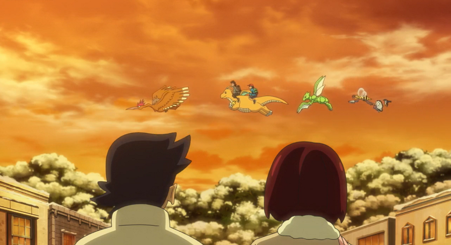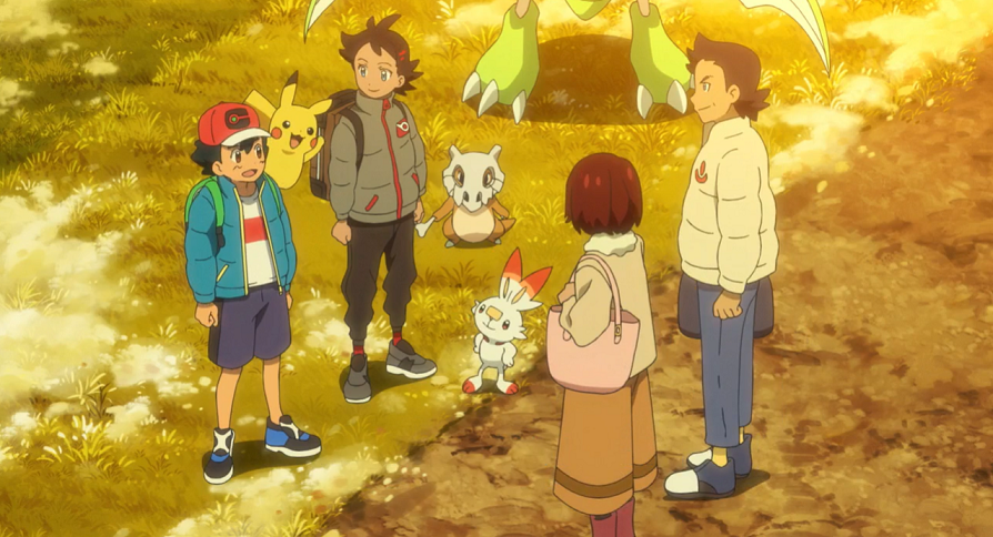 Fleißig und gemeinsam mit den Menki sind alle weiterhin am Suchen. Die Sonne ist bereits am Untergehen, als sie von einem Ibitak einen Hinweis erhalten. Auf Ashs Dragoran folgen ihm dieser, Goh, Hopplo und Tragosso sowie Gohs weitere Pokémon. Dabei werden sie in der Luft von Gohs Eltern gesehen, die inzwischen auf dem Nachhauseweg sind.