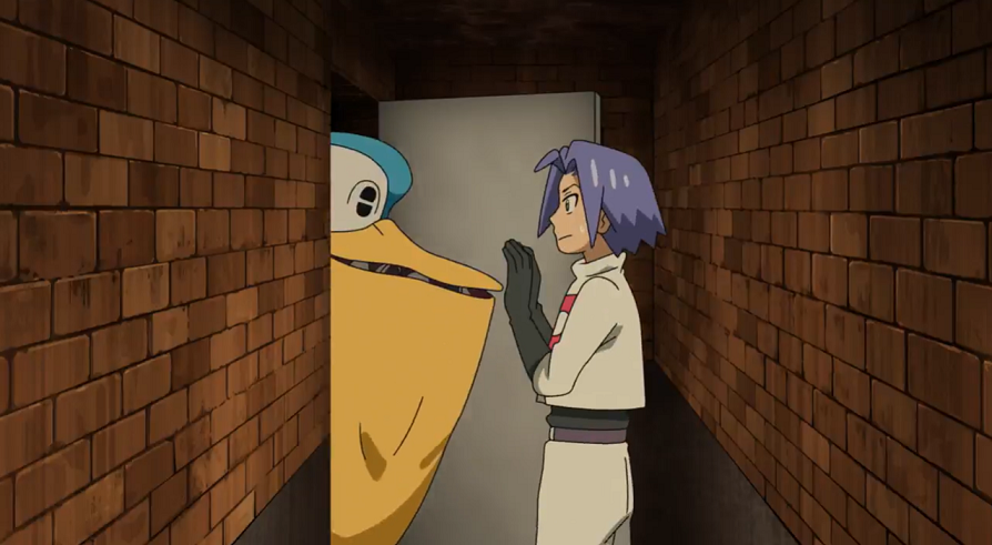 In Team Rockets Geheimversteck spielt sich nun eine ähnliche Szene wie zu Beginn ab. Wieder bestellt Team Rocket die Spezialmaschine, um sich mit Training zu beschäftigen und wieder klingelt es an der Tür. Anstelle des Pelippers taucht dieses mal jedoch Tompador auf. Kurz darauf schließt James wieder die Tür.