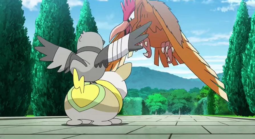 Nachdem Dusselgurr fertig gefressen hat, stellt Chloes Bruder ihm die Familie Kirsch vor. Als Chloe Dusselgurr mit ihrem Voldi bekannt machen will, ergreift Dusselgurr die Panik. Voldi, das Dusselgurr nun fangen will, jagt es in der Folge durch das ganze Wohnzimmer. In einem geschickten Moment gelingt es Dusselgurr, sich auf Voldis Hintern zu setzen, woraufhin dieses verzweifelt und erfolglos versucht, das Dusselgurr abzuschütteln. Der folgenden Elektro-Attacke kann das Täubchen-Pokémon mit einem Flugmanöver ausweichen, sodass sich Voldi gegen das nun sichtlich gut gelaunte Dusselgurr geschlagen geben muss. Dusselgurr scheint auf einmal jegliche Angst vor Voldi verloren zu haben, was Professor Kirsch mit der Zerstreutheit, die man den Dusselgurr nachsagt, erklärt.