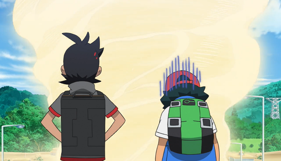 In Malvenfroh City angekommen, können Ash und Goh begutachten, wie bereits große Teile der Stadt im Sand begraben sind. Als die beiden das angenehme, singende Geräusch hören, ist Ash, der bisher wenig Motivation für die Untersuchung hat aufbringen können, auf einmal wie ausgewechselt. Um die Ursache des Geräusches zu finden, beschließen die beiden, zusammen mit ihren Pokémon und ausgerüstet mit Schutzbrillen, ebenfalls in den Sandsturm zu gehen.