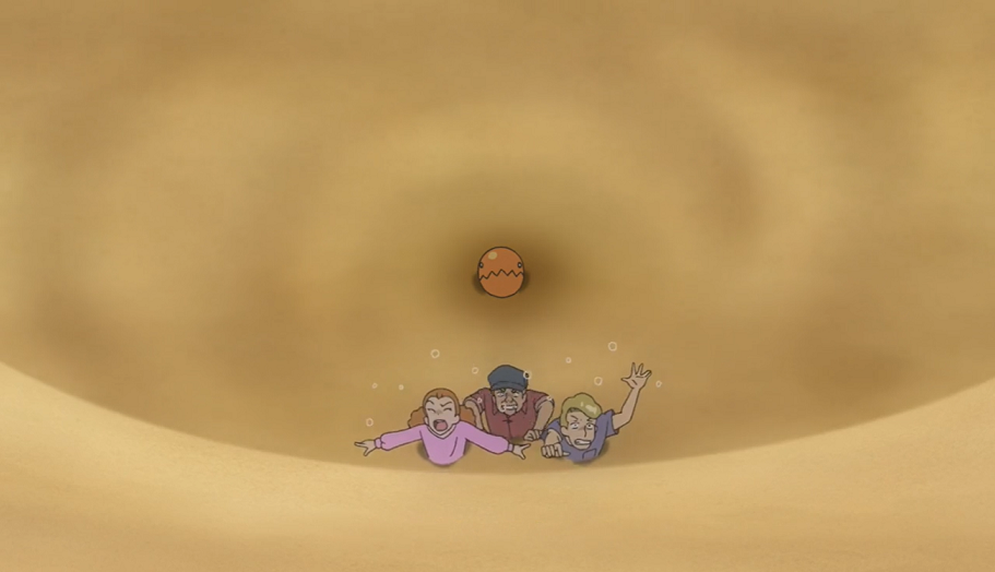Nachdem sie sich durch den Sturm gekämpft haben, erreichen sie nach einiger Zeit dessen ruhigeres Inneres. Dort finden sie sich in einer gewaltigen Sandwüste wieder, die die Stadt unter sich begraben hat. Als sie aus der Ferne plötzlich Hilfeschreie vernehmen, eilen die beiden los und stehen plötzlich vor der Fallgrube eines Knacklions, in die drei Personen langsam hineinrutschen. Goh sieht nur eine Lösung, um die drei zu retten: Er will das Knacklion fangen. Kann dieses seinen ersten Wurf noch erfolgreich mit einem Sandspritzer abwehren, gelingt es Goh im zweiten Versuch mit einem Curveball-Wurf, das Boden-Pokémon zu fangen. So können die Geretteten froh und dankbar über die rechtzeitige Hilfe wieder den Rückweg aus dem Sandsturm antreten, während Ash und Goh sich weiter auf die Suche nach der Quelle des Geräusches machen. Dabei treffen sie auf ein Vibrava, das ihnen mit seinen Ultraschallwellen gewaltige Kopfschmerzen bereitet. Goh kann dieses Pokémon mit Hilfe eines Curveballs und im Zusammenspiel mit seinem Kickerlo, das den Pokéball volley auf Vibrava kickt, ebenfalls im zweiten Versuch fangen.
