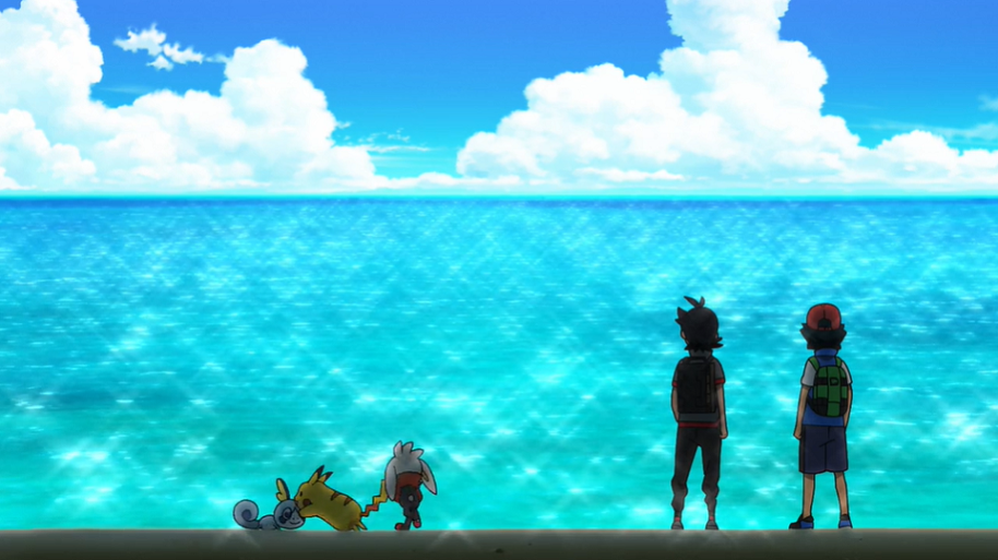 Auf dem Weg dorthin über den Strand genießen die beiden den tollen Anblick des Meeres. Dabei fällt Goh ein Gufa im Sand ins Auge. Natürlich lässt er sich die Gelegenheit nicht entgehen und fängt das Wasser-Pokémon.