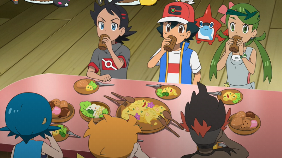 Im Haus trifft Ash auf seine Pokémon aus der Alola-Region, um die sich nun Kukui und Burnett kümmern: Bauz, Fuegro, Melmetal und Wolwerock (Zwielichtform), die sich vor lauter Freude zuerst auf ihn und anschließend auf Goh stürzen.