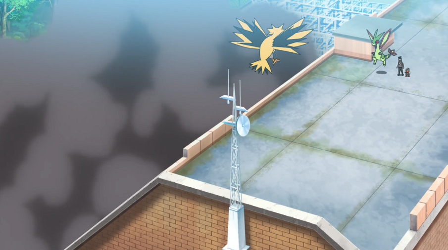 Auf dem Dach angekommen, wird Goh bereits von Zapdos erwartet. Er schickt Libelldra in den Kampf gegen Zapdos und kann es mit Feuerodem kurz aus dem Gleichgewicht bringen. Diese Gelegenheit will er nutzen und wirft einen Pokéball auf Zapdos, aus dem das Legendäre Pokémon allerdings ausbricht. Goh verzweifelt ein wenig, da er nicht weiß, wie er Zapdos bekämpfen soll.