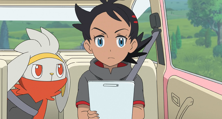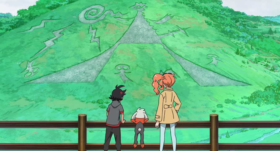 Goh ist in der Zwischenzeit mit Sania in Turffield angekommen, wo die beiden die Geoglyphe am Hang eines benachbarten Hügels unter die Lupe nehmen. Diese berichte laut Sania von der Legende von Galar, der zufolge vor langer Zeit ein Held mit Schwert und Schild randalierende gigantische Pokémon aufgehalten habe. Sania gibt an, den Zusammenhang der Legende und der Dynamaximierung zu untersuchen. Dies habe ihre Großmutter ihr aufgetragen. Als die beiden sich über die Erdzeichnung unterhalten, erzählt Goh ihr von seiner Begegnung mit Lugia. Als das Legendäre Pokémon damals aufgetaucht sei, habe es auch schwarze Wirbel gegeben, wie sie in der Zeichnung dargestellt sein könnten. Ebenso berichtet Goh ihr davon, als Ash und er beim ersten Flug in die Galar-Region das ihnen unbekannte Endynalos in den Wolken gesehen haben.