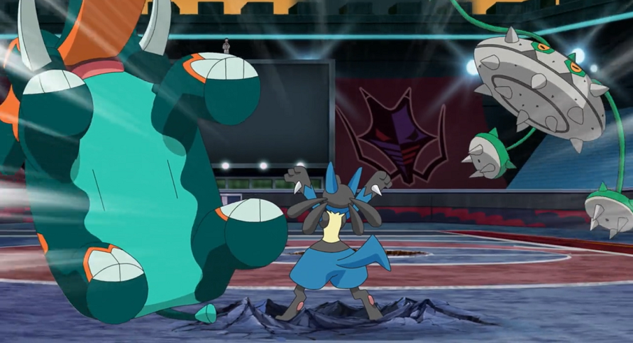 Riolu hat sich zu Lucario entwickelt und kann sich nun durch die zusätzlich gewonnene Kraft leicht aus seiner Situation befreien. Mit Aurasphäre kann es sowohl Tentantel als auch Patinaraja zu Roses Erstaunen locker besiegen.
