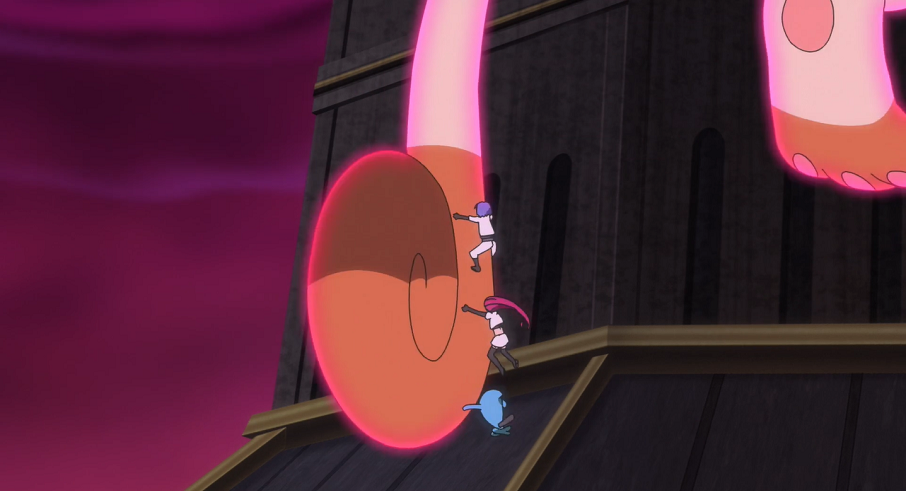 Unterdessen wird Team Rocket weiter von seinem gigadynamaximierten Mauzi verfolgt. Als Jessie diesem gegenüber laut Giovanni und dessen Anweisungen erwähnt, stoppt es plötzlich die Verfolgung und beginnt, den Turm emporzuklettern, auf dessen Spitze sich Endynalos befindet. Jessie, James und Woingenau hängen sich dabei an den Schwanz des riesigen Mauzi.