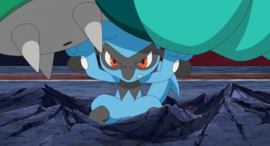 Endynalos attackiert Delions geschwächtes Glurak nun mit Dynamax-Kanone. Zwar können Delion und Glurak ausweichen, allerdings dringt die Attacke von der Spitze des Turmes bis in die Arena durch, in der Ash und Rose kämpfen. So werden Ash und dessen Pikachu, das gerade dabei war, zu attackieren, aus dem Feld geschleudert. Das versuchen Roses Pokémon auszunutzen. Allerdings kann das herbei eilende Riolu den Angriff auf seinen Trainer und Pikachu verhindern, indem es Patinarajas Rüssel und Tentantels Stachelkugel mit seiner gesamten Kraft aufhält. Von beiden unter Druck gesetzt, entwickelt sich Riolu.