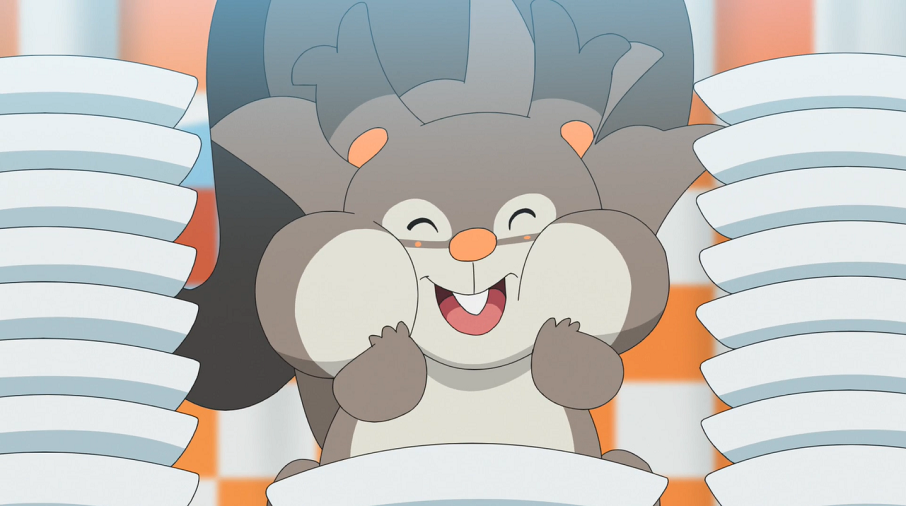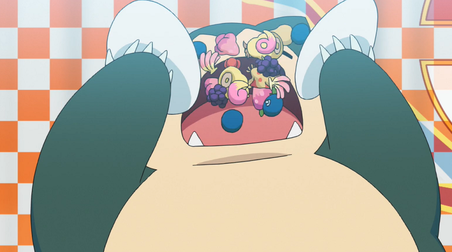 Unter der Beobachtung von Professor Kirsch, dessen Tochter Chloe und seiner vom Wettessen begeisterten Assistentin, die den Wettbewerb als Zuschauer verfolgen, legen die Pokémon los. Dabei zeigen sich die verschiedenen Stärken und Stile der teilnehmenden Pokémon. Während die größeren Pokémon die Beeren mit verschiedenen Techniken am Stück verschlingen, sind kleinere Pokémon damit beschäftigt, die Kerne der Beeren herauszutrennen, was sie allerdings wertvolle Zeit kostet. Gohs Raffel gelingt das besonders schnell; überzählige Kerne lagert es in seinen Backentaschen, um sie am Ende gesammelt auszuspucken. Zeitgleich macht auch Morpeko, das einen Beerenteller nach dem anderen im Rekordtempo verschlingt, von sich Reden.