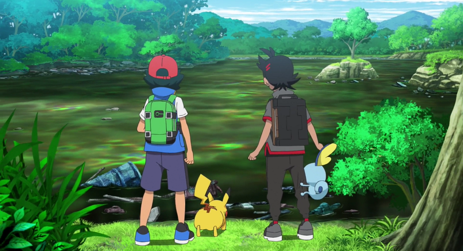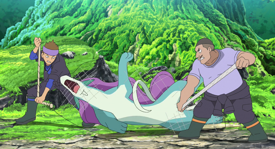 Ash und Goh erreichen kurz das darauf den im bergigen Gebiet liegenden Wald. Als sie diesen durchqueren, um zum See im Inneren zu gelangen, zieht ihnen auf einmal ein strenger Gestank in die Nase. Er führt sie schließlich zu besagtem See, von dem sie eigentlich angenommen hatten, dass Suicune ihn gereinigt habe, den sie nun jedoch verdreckt und voller Müll vorfinden. Laute Rufe von der anderen Seite des Sees lenken ihre Aufmerksamkeit auf eine Gruppe von vier Männern, die mit Hilfe ihrer Giftpokémon Deponitox, Unratütox, Sleimok und Smogmog und deren Attacken den See verschmutzen und zusätzlich aus Lastwagen Müll in den See ablassen. Während Goh Officer Rocky benachrichtigen will, eilt Ash sofort mit Pikachu zu den Übeltätern, um diese zu stellen. Nachdem Pikachu keine Mühe mit Unratütox hatte, kommt Goh dazu und schickt Liberlo zur Unterstützung in den Kampf, der allerdings abrupt unterbrochen wird, als der Boss der Gruppe auftaucht und darauf hinweist, dass Suicune wieder aufgetaucht sei. Tatsächlich steht das Legendäre Pokémon am anderen Ufer und reinigt den See umgehend. Mit Hilfe zweier Attacken macht es die Gefährte der Männer unbrauchbar und rennt über das Wasser zu ihrem Ufer, um sich ihnen im Kampf zu stellen. Der Boss erklärt unverblümt gegenüber Suicune, dass er annehme, dass dem Pokémon bald die Kraft ausgehe. Ash und Goh erkennen, dass es sich bei den Männern um Pokémon-Jäger handelt, deren Ziel es ist, Suicune zu schwächen, um es gefangen nehmen zu können. Die Jäger beginnen, Suicune mit ihren Gift-Pokémon zu attackieren. Ash und Goh wollen dem Wasser-Pokémon mit Pikachu und Liberlo zur Seite stehen, werden allerdings von Deponitox aufgehalten. So müssen sie mitansehen, wie die Männer das vergiftete und geschwächte Suicune fesseln können. In seiner Verzweiflung kommt Goh eine Idee: Er wirft einen Pokéball auf Suicune, um es zu fangen. Nach dem Fang landet der Pokéball über Deponitox' Kopf direkt wieder in Gohs Hände. Nach drei abschließenden Wacklern des Balles hat er das Legendäre Pokémon gefangen und damit erst einmal gerettet.