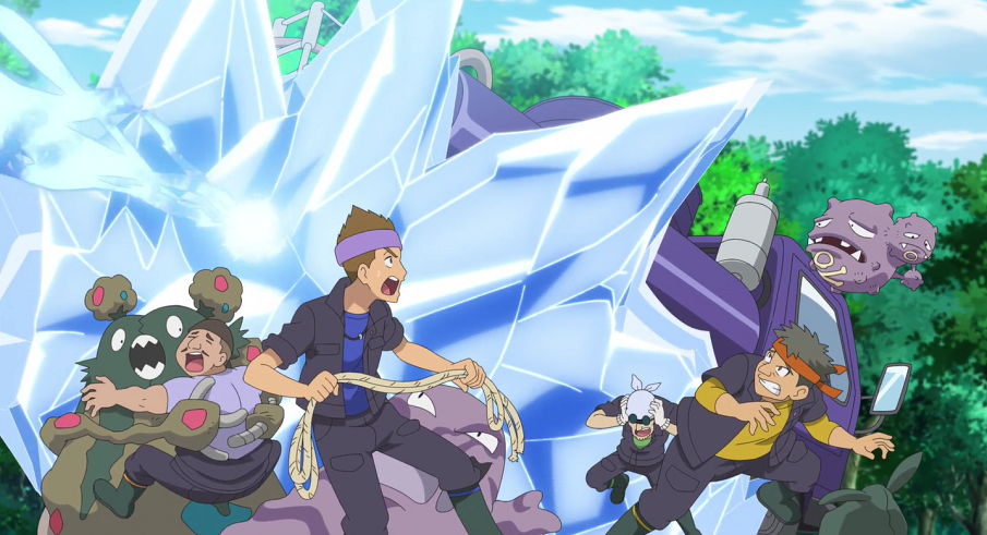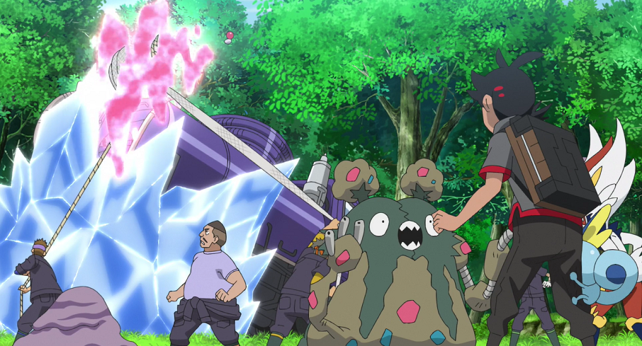 Plötzlich schlägt Alola-Kokowei Alarm und kündigt die Jäger an, die inzwischen Suicunes Aufenthalt ausfindig gemacht haben und sich nun an Goh rächen wollen. Als die Jäger eintreffen und angreifen, hat Goh sich aber bereits auf alles eingestellt: Während seiner Abwesenheit hat er gleich noch erfolgreich ein Traumato fangen können, das nun mit seinen Psycho-Attacken Liberlo im Kampf gegen die Gift-Pokémon der Jäger unterstützt. Suicune beobachtet den Kampf und die Mühen Gohs dabei sehr aufmerksam.