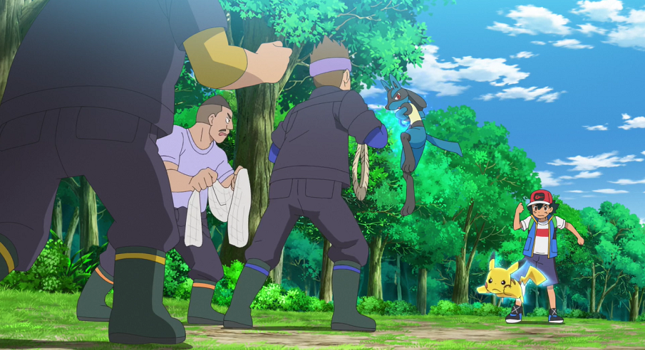 Ash versteckt sich mit Pikachu und Lucario vor den Jägern im Wald, die sie vergeblich suchen.