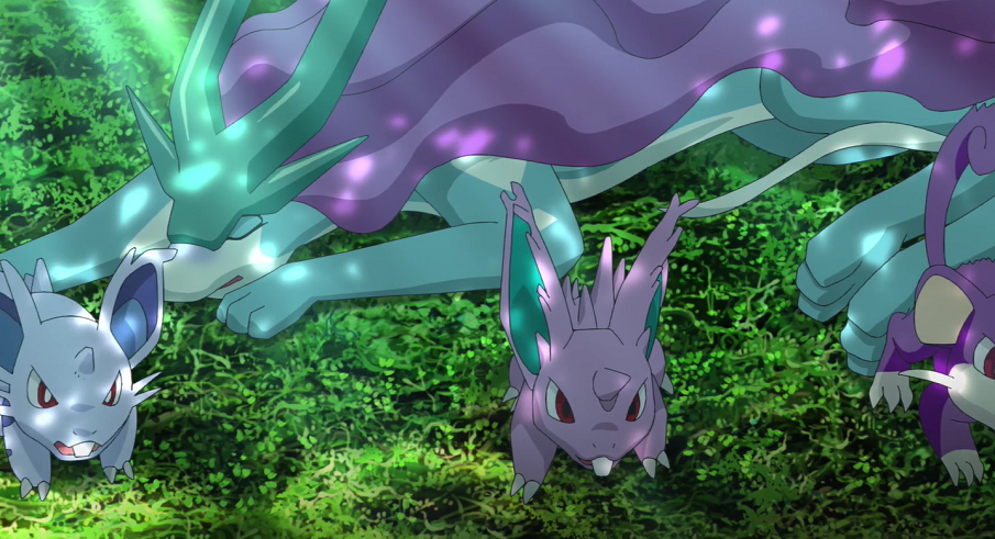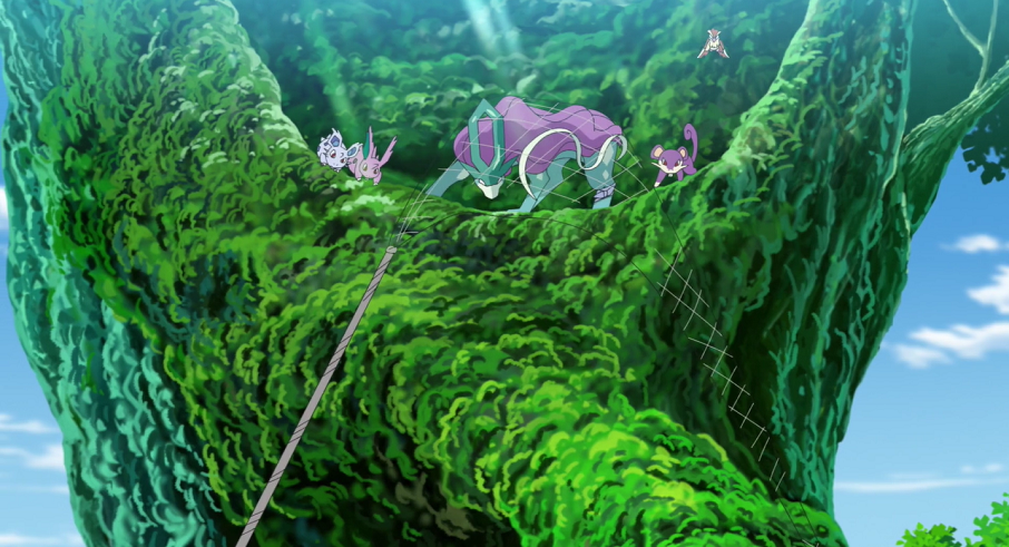 Die Pokémon-Jäger sind wütend und wollen sich Suicune nun mit Gewalt holen. Ash schickt Lucario in den Kampf, das Pikachu unterstützen soll, und weist Goh an, Suicune in Sicherheit zu bringen. Dieser macht sich umgehend auf den Weg. Beim Rennen durch den Wald stolpert er allerdings, wodurch ihm der Pokéball aus der Hand fällt und Suicune so herausspringt. Dieses ist wütend und versteht nicht, dass Goh es in ein Pokémon-Center bringen möchte. Mit einem Eisstrahl schießt es Goh daher den Pokéball aus der Hand und kehrt ihm geschwächt den Rücken. Mit letzter Kraft schleppt es sich in ein Versteck auf einem Baum. Als Goh dort hochklettert, bemerkt er mit Nidoran♂, Nidoran♀, Rattfratz und Taubsi jene Pokémon, die Suicune ursprünglich am See entdeckt haben und es nun beschützen, da es ihnen durch das Säubern des Sees geholfen hat. Um Suicune und die Pokémon zu beschützen und den Ort zu bewachen, lässt er neben Liberlo auch noch sein Alola-Kokowei zurück, ehe er sich selbst mit Memmeon und Raichu auf den Weg macht, um Hilfe für Suicune zu organisieren.