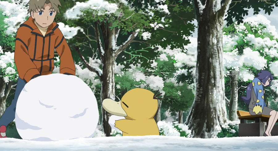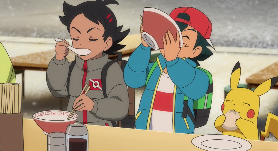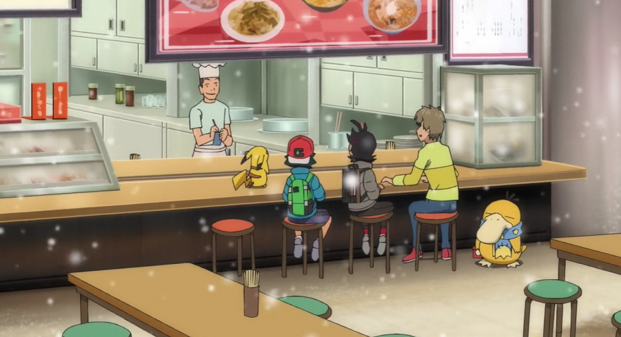 Ash, Goh und Pikachu haben mittlerweile ein Restaurant aufgesucht, wo sie sich aufwärmen und wieder zu Kräften kommen können. Da ihnen das Essen so gut schmeckt, kommen sie mit einem jungen Mann, der am Tresen neben ihnen sitzt, ins Gespräch. Er schwärmt ebenfalls von dem Essen. Dabei bemerken sie das Enton des Mannes, das geschlossene Augen hat, einen blauen Schal trägt, der ihnen sofort auffällt, und das erkältet zu sein scheint. Der Mann erklärt, dass das Enton keine Kälte möge und es deshalb stets seinen blauen Lieblingsschal trage. Da das Enton plötzlich starke Kopfschmerzen zu haben scheint, beginnt es seine Psychokräfte einzusetzen, wodurch es nicht nur Ash, Goh, Pikach und den Mann, sondern auch sämtliches Inventar zum Schweben bringt. Der Mann streckt seinen Arm aus und beginnt, Enton am Kopf zu tätscheln, wodurch dieses sich beruhigt und die Kopfschmerzen sowie entsprechend auch die eingesetzten Psycho-Kräfte nachlassen. Dem Mann tut der kurze Schreckmoment sehr leid, weshalb er die beiden zu einem Ramen einlädt.
