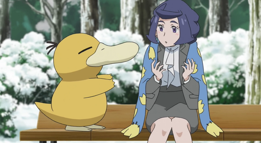 Am nächsten Morgen sind Chloe und Christin wieder im Labor. Dort trifft Chloe auf Ash und Goh, die gerade gemeinsam frühstücken. Sie erkundigt sich nach deren Pokémon-Suche am Vortag. Ash und Goh berichten ihr von ihrem Misserfolg, erzählen ihr aber auch von der anschließenden Begegnung mit dem jungen Mann und seinem Enton und dem blauen Schal. Chloe wird sofort hellhörig und erkundigt sich nach dem Verbleib des Mannes. Da Ash und Goh nichts darüber wissen, begeben sie sich gemeinsam in die Stadt, wo sie überall herumfragen, allerdings ohne Erfolg. Schließlich kommen sie im Park an, wo sich Chloe, ernüchtert über die bisher erfolglose Suche, auf eine Bank setzt. Es dauert nicht lange, bis um sie ebenfalls jemand einen blauen Schal legt. Als sie aufblickt, bemerkt sie das Enton. Kurz darauf taucht auch sein Trainer auf, um sich für sein Enton zu entschuldigen. Während sich Ash und Goh darüber freuen, den Mann wiederzusehen, zögert Chloe nicht lange und bittet ihn, mit ihnen zu kommen.
