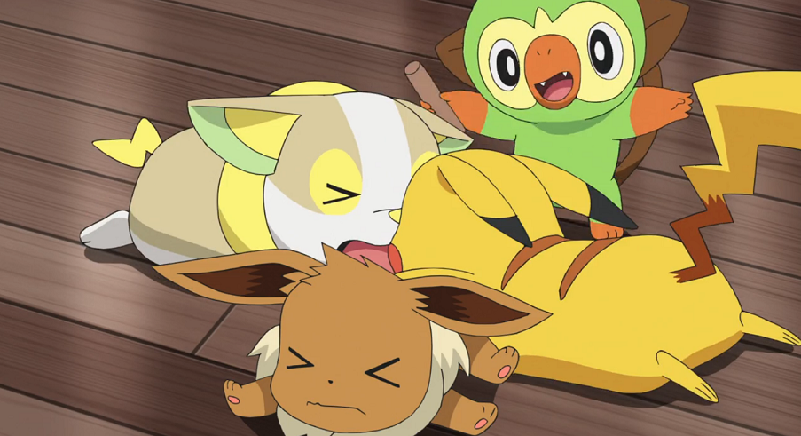 Abends im Kirsch-Park freut sich Goh sehr über sein neues Pokémon. Chimpep hat auch keinerlei Probleme, sich mit Pikachu, Voldi, Evoli und den anderen dort lebenden Pokémon anzufreunden.