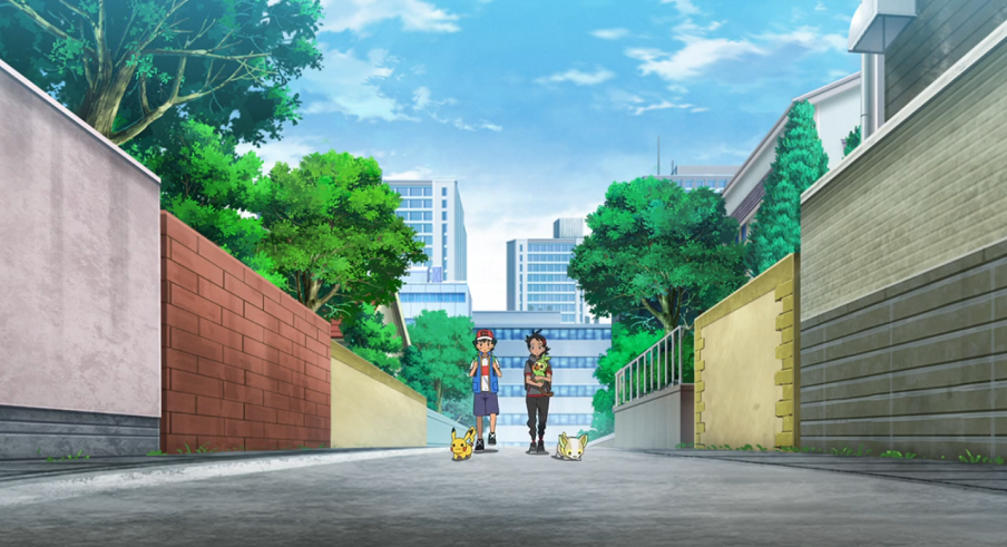 Die von Voldi aufgenommene Fährte führt sie hinauf aufs Dach des Instituts, wo eine Tür offen gestanden hat. Von dort ausgehend kann Voldi die Spur bis in die Stadt hinein weiterverfolgen. Ash und Goh, mit Chimpep im Arm, laufen dem Elektro-Pokémon dabei interessiert hinterher bis dieses vor einem Grundstück halt macht. Da Chimpep sofort über die Mauer des Grundstücks springt, nehmen Ash und Goh an, ihr Ziel gefunden zu haben. Daher klingeln sie, um mit Chimpeps Trainer in Kontakt zu treten, als Chimpep auf einmal auf einem Dodri über die Mauer zurück auf die Straße springt.