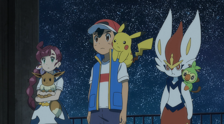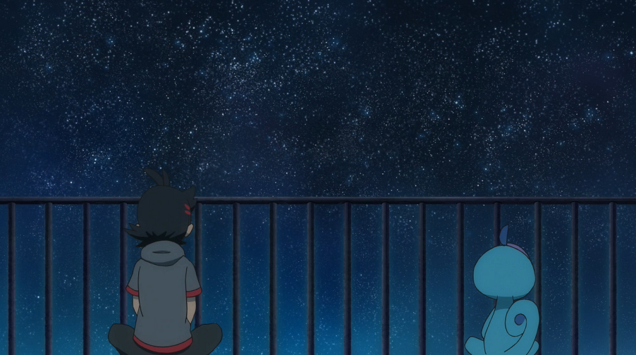 Es ist bereits dunkel, als Goh ein Gebäude auf einem kleinen Hügel oberhalb der Stadt erreicht. Auf dem Dach trifft er tatsächlich auf Phlegleon, das in den Nachthimmel blickt, und setzt sich, beobachtet von Ash und Chloe, neben dieses. Er entschuldigt sich dafür, es aus der Höhle gezerrt zu haben und erzählt ihm, dass er sich selbst als Kind lieber zurückgezogen habe. Er selbst habe damals nicht gewusst, weshalb er lieber für sich alleine war, was ihn sehr frustriert habe. Da seine Eltern oft nicht zu Hause und arbeiten waren, habe er daher oft die Sterne angeschaut. Deshalb kam ihm der Gedanke, dass es Phlegleon ähnlich gehen könne. Er erklärt dem Wasser-Pokémon, es gut verstehen zu können und dass es tun könne, wonach es sich fühle. Wenn es eines Tages wolle, würde er sich sehr freuen, wenn es dann aufgeschlossener wäre. Goh fängt nun an zu weinen, was Phlegleon bemerkt. Lächelnd nimmt es ihm eine Träne von der Wange, womit es beginnt, sich unsichtbar zu machen. Bevor es ganz verschwindet, verspricht Goh ihm noch, dass er jederzeit in Gedanken bei ihm sein werde, auch wenn sie nicht beieinander sind.