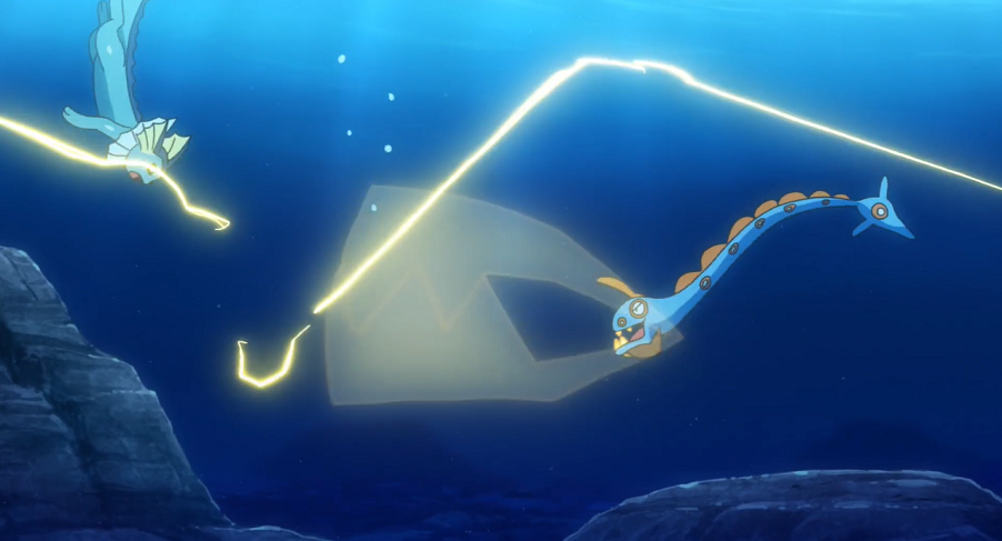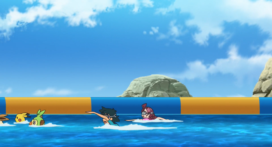 Gemeinsam machen sich alle mit ihren Pokémon ans Training und beginnen, mit ihren Pokémon umherzuschwimmen. Ash muss dabei feststellen, dass sein Pescragon aufgrund seines Körpers kein wirklich schneller Schwimmer ist. Als Ash seinem Pokémon helfen und es anschieben will, geht es unter. Dabei stellen sie jedoch fest, dass es seine Schnelligkeit zu Fuß auf dem Meeresboden einsetzen kann.