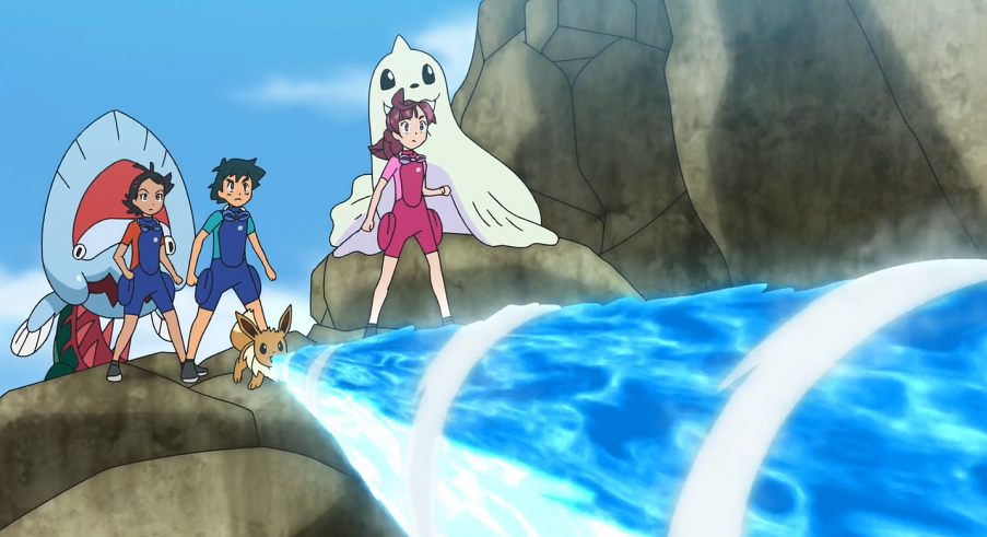 Chloe, Evoli und Jugong müssen feststellen, dass sie so einfach nicht wieder herauskommen und hoffen daher darauf, dass Ash und Goh nach ihnen suchen und sie befreien. Von außen und von unter Wasser versucht aber Aalabyss, mit Gewalt in das Innere vorzudringen.