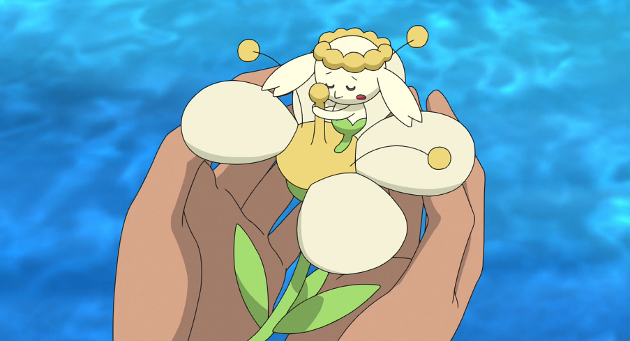Ash und Goh gießen im Blumenfeld des Kirsch-Parks Gohs beide Kokowei, Myrapla und Knofensa, als auf einmal Gohs blaues, gelbes, oranges und rotes Flabébé im Eiltempo an den beiden vorfliegen und sich ein kleines Rennen liefern. Als sie zum Stillstand kommen, beginnen die vier Pokémon sich zur Freude der beiden jeweils zu Floette zu entwickeln. Doch schnell bemerkt Goh, dass sein weißes Flabébé fehlt und sich nicht entwickelt hat. Sofort machen sie sich auf die Suche nach dem Feen-Pokémon, das einen Augenblick später herbeigeflogen kommen. Allerdings nur sehr langsam und unrund. Als Goh es vor einem Sturz bewahrt und auffängt, bemerken sie, dass dem Flabébé eines seiner weißen Blütenblätter fehlt. Um Flabébé zu helfen, wollen die beiden für es eine neue Blume auftreiben. Da Flabébé aus der Kalos-Region stammt, erhoffen sie sich dort fündig zu werden.