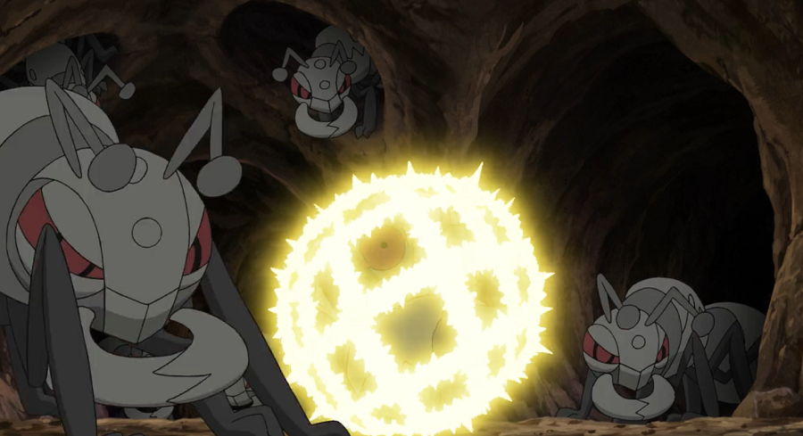 Verfolgt von Fermicula treffen sich Ash, Goh, Chloe, Jessie und James mit ihren Pokémon an einer Kreuzung des Tunnelsystems wieder. Umzingelt von den Eisenameisen wollen sie den Kampf gegen diese aufnehmen. Indirekte Unterstützung kommt dabei von Chimpep und Woingenau, die auf der Flucht vor den Furnifraß wieder in den Untergrund zurückgekehrt sind und diese nun im Schlepptau mitbringen. So kommt es zum Kampf zwischen diesen beiden rivalisierten Pokémon, während sich Goh über das Wiederfinden von Chimpep freut. Schnell ergreifen alle die Flucht vor dem ausgebrochenen Kampf an die Oberfläche. Da sich eines der Fermicula dabei an Goh geheftet hatte, nimmt dieser die Gelegenheit war und fängt das Pokémon.