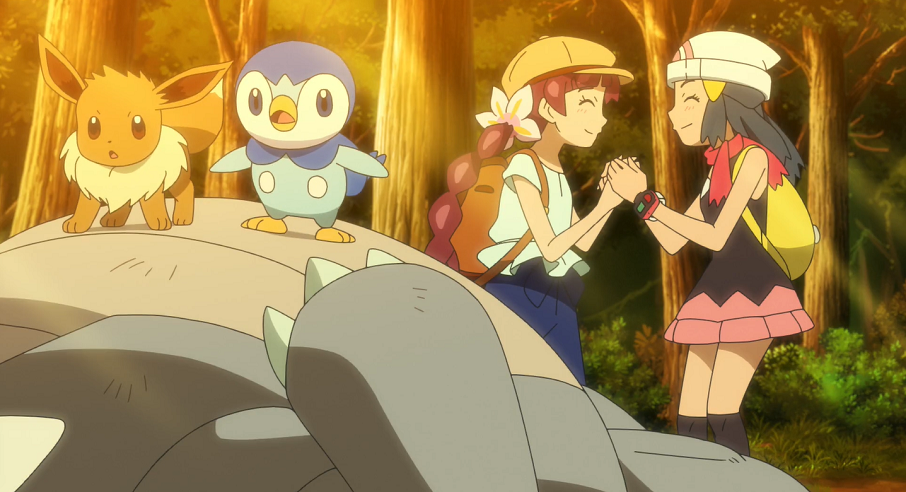 Mit dem Flugzeug erreichen Chloe und Evoli ebenfalls die Sinnoh-Region. Überwältigt von der Größe der Stadt, in der sie angekommen ist, weiß Chloe erst einmal nicht, wo sie hin soll. Auf der Suche nach einem Informationscenter für Touristen sehen sie und Evoli auf einem großen Bildschirm in einer Häuserfassade ein Interview mit der berühmten Koordinatorin Johanna, die von einem Pokémon-Wettbewerb in Ewigenau berichtet. Evoli ist sofort Feuer und Flamme, sodass die beiden sich vornehmen, mit dem nächsten Bus nach Ewigenau zu fahren, um den Wettbewerb dort zu besuchen. Da bis zur Ankunft des Busses allerdings noch etwas Zeit ist, beschließen die beiden, sich in der Umgebung etwas umzusehen. In einem Randgebiet der Stadt bemerken sie ein Staralili, das durch Evoli beim Spielen mit diesem wütend wird. Das ruft die Gruppe des Staralili auf den Plan, weshalb Chloe und Evoli schnell die Flucht ergreifen müssen. Schließlich erreichen sie dadurch ein dichtes Waldgebiet, in dem es kurz darauf auch noch anfängt in Strömen zu regnen.