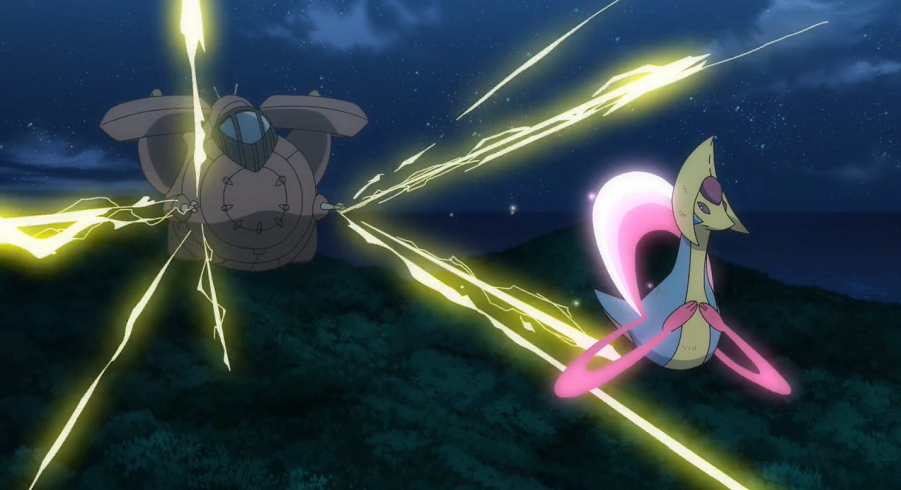 Chloe und Lucia nähern sich dem Leuchten und stellen fest, dass es sich dabei um das verwundete und stark geschwächte Cresselia handelt.